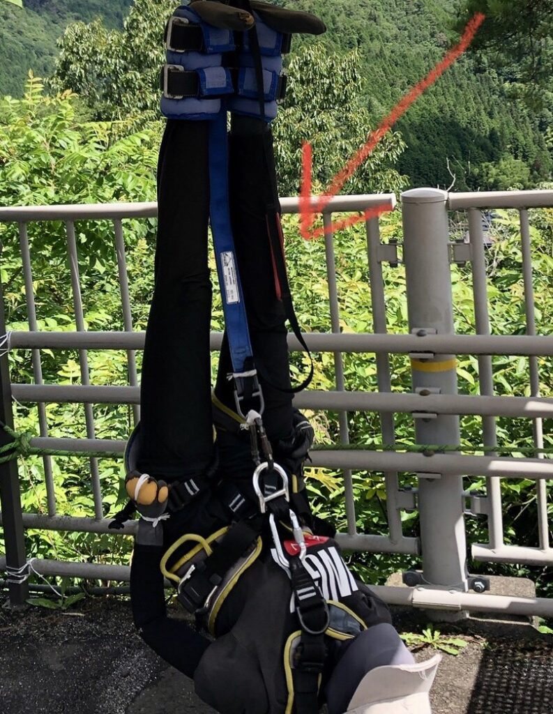 バンジージャンプ後は写真のように頭が下の状態のため、足元にある赤いひもを探して引っ張らないと引き上げられる約3分間ずっと頭に血が上ることになります。