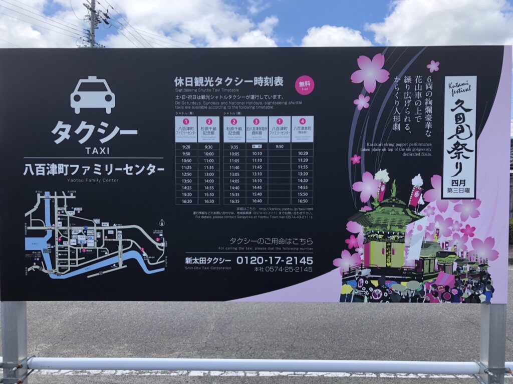 車がない人は最終的にはタクシーに頼る必要がある。八百津町ファミリーセンターから岐阜バンジー受付までタクシーで約10分。